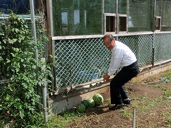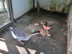 ガチョウのガー子さんに「スイカ」のプレゼントが届きました。この3月まで本校に勤務していたO教頭先生が、自宅で作ったスイカを「去年もこの時期にガー子さんにやっていたから」と所用の折に立ち寄って下さったのでした。