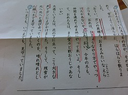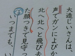 子供たちの朗読用のプリントにはどんな風に読むかという「自分なり」の工夫が、記号などで示されています。これは、K.Rさんのものです。二重線は強くよむところ、波線はゆっくり読むところです。って、あれ? 初めと終わりに、何か青い記号があります。アップしてみましょう。