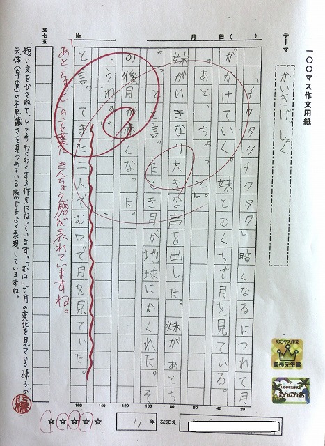この「100マス作文」には、「たんにん賞」があります。担任の先生が読んで、「これは!」という作文にシールが貼られます。さらに、そういう作品を校長先生が読んで(実は密かに?教室を訪問して子供たちが書いた100マス作文は全部読んでいるのですが)、「おおお! これは!!!」と膝をたたき、うならせた作文には「校長先生賞」が贈られるのです。E校長先生は「なかなか出ない賞です。乱発はしません!」と言い切っていますので、この「賞」が出る作文はそれだけの内容があるということです。