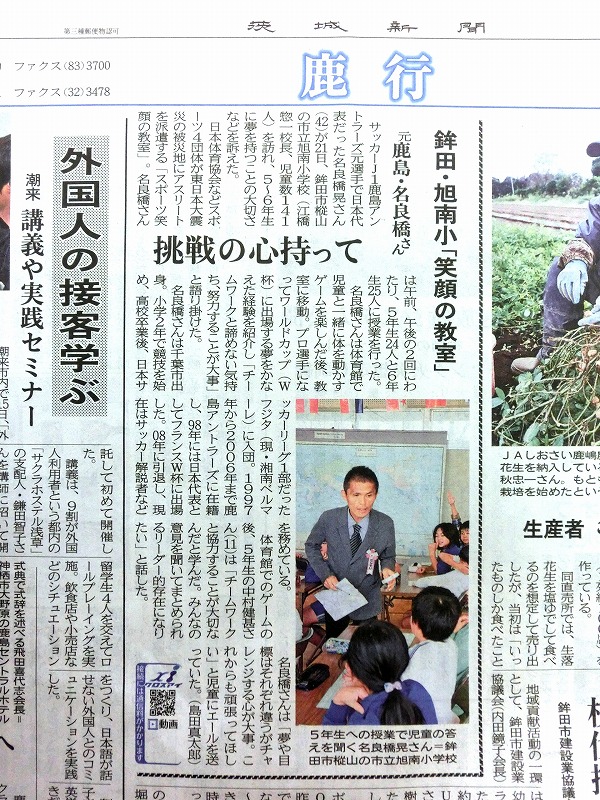 10月21日に「スポーツこころのプロジェクト」で本校を訪れた元・鹿島アントラーズの名良橋晃さんの授業のようすが22日付けの「茨城新聞」鹿行版に掲載されました。
