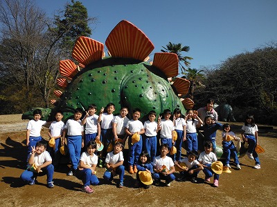 1,2年生の快晴の遠足です。水戸市の「森林公園」、通称「きょうりょう公園」に出かけました。まずは、きょうりゅうの前での記念写真からどうぞ。