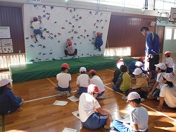 本日の朝会はブロックごと。体育館では、3,4年生がボルダリングにチャレンジしています。普段はあまり手をだしていない子も、今日は挑んでいます。