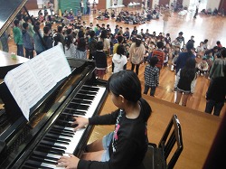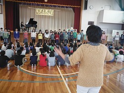 午後の部のスタートは,5,6年生の合唱。今月14日(金)に旭中学校で行われる鉾田市児童生徒音楽会にむけて練習している合唱の披露です。中間発表という感じでしょうか。本番に向けた度胸試しという意味もあります。(^-^; 歌い始めた頃に比べると,かなり声も出るようになり,音程もしっかりしていきたようです。