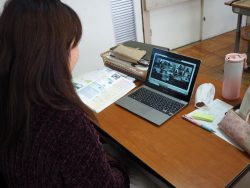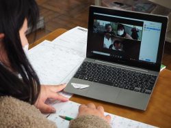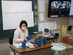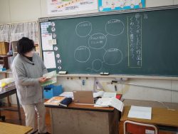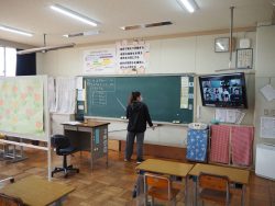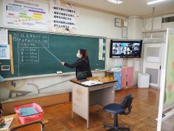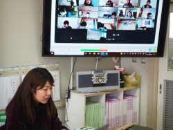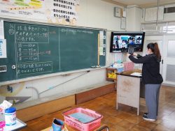 教室での対面授業における協働的学びには,及びませんが,ズーム・大型画面そして黒板をフルに活用して,児童の表情を確認しながら,対話をとおして学習課題を解決しています。