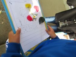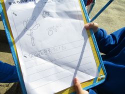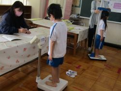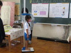 2年生が外で、「春みつけ」を」していました。モンシロチョウが菜の花にとまったり、ミツバチが花の蜜をすっていました。観察カードに一生懸命記入していました。身体測定も行われました。身長と体重を測りました。1年生はちょっと緊張気味でした。
