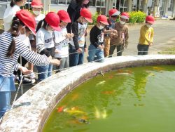 4.12 中休みの様子1年生は、鯉に餌をあげていました。「ごはんだよ」と言って仲良く餌をあげていました。鯉も喜んでいたようです。3年生は、先生の監督のもとチャイルドマウンテンができるようになりました。4年生から6年生は楽しく遊んでいました。