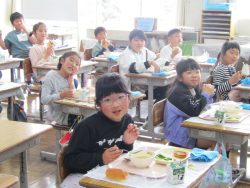 今日の給食は、パンとぽ、サラダです。1,2年生は、カメラを向けると「おいしい顔」をしてくれました。