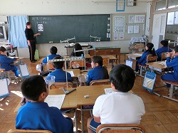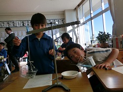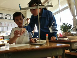 ▲ 机の上の理科実験道具のようなものは、てんびんです。カップにものをのせて、重さを学ぶのです。