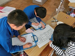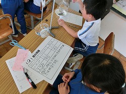▲ 自分たちではかった重さを使って、「問題」を作りました。他の班が作った問題を解きまくっています。真剣に、一生懸命にとりくむ3年生です。(^_^)v