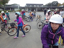 5,6年生の白浜少年自然の家での宿泊学習。初日の20日は入所式後、自転車で北浦べりを27km走る「チャレンジ」です。全員がヘルメットを被り、子供たちは誰も経験のない長距離のサイクリングに出発しました。