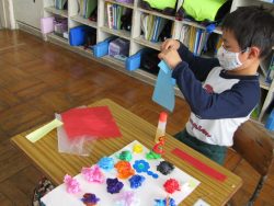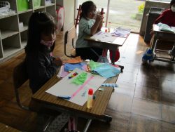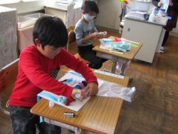 図工では、先生がバックミュージックを流し、鼻歌を歌いながら気持ちよく作品作りに取り組んでいました。