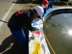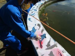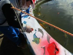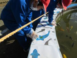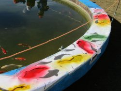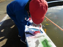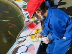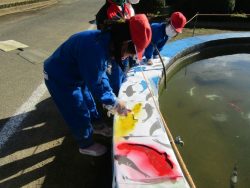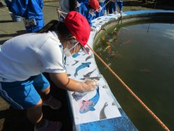 1年生と担任の先生が鯉の池の淵をペンキでステンシルしました。とっても素敵です。これからも鯉をよろしくお願いいたします!