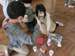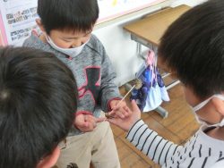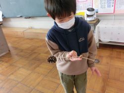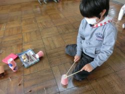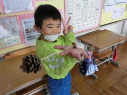 生活科で、秋のおもちゃを作りました。拾ってきたドングリや落ち葉で作成しました。とっても素敵な秋のおもちゃができました。