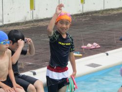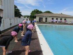 低学年のプールの授業です。1年生は、はじめてのプールにドキドキの様子でした。