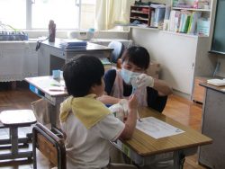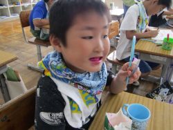 6.28 歯みがき指導 2年生保健師さんと歯科衛生士の方で、歯みがき指導がありました。染め出しをして、歯の汚れを調べました。磨き残しがあったようですね。よく磨けるようにがんばりましょう。