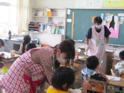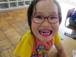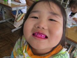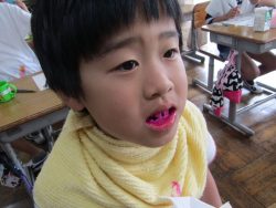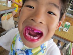 保健師さんと歯科衛生士の方で、歯みがき指導がありました。染め出しをして、歯の汚れを調べました。磨き残しがあったようですね。よく磨けるようにがんばりましょう。