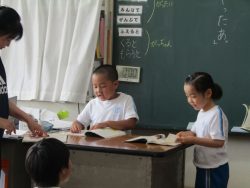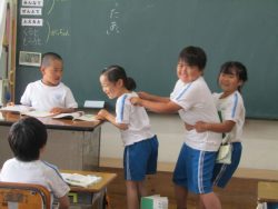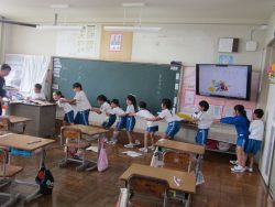 となりの教室では、1年生が「大きなかぶ」の練習をしていました。