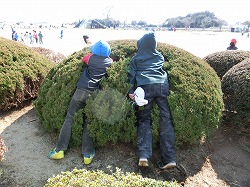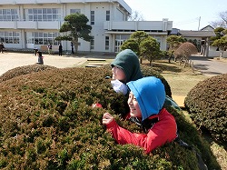 本日は暖かな昼休みです。子供たちが遊んでいる校庭に出ると、植え込みに怪しい姿が…。