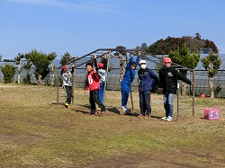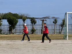 5年生がみんなで遊んでいるのです。さて、この二人、どうしてフードをかぶっているのかというと、紅白帽子だと見つかるからだとか。(>_<) いやはや、それって反則ぎみですけど。