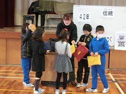 さて、袋から出るのはどんな「面」でしょう。かぶってみると、「ひょっとこ」や「狐」、そして女の子は「おかめ」です。(*^_^*) 見ている子供たちに大受けです。(^_^)v 「面」は木で出来ていて、思ったよりも重いということでした。大事なものなので、丁寧に扱いました。