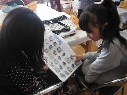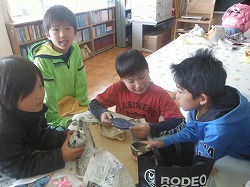 自分の作品を受け取った子供たちが,包みを広げて,互いに見せ合っています。