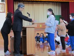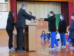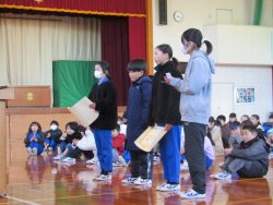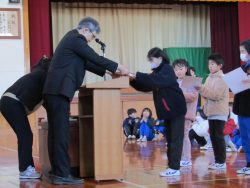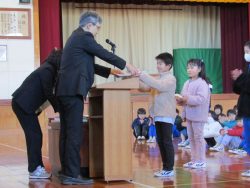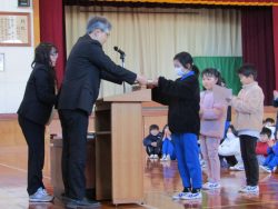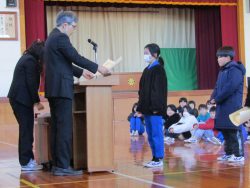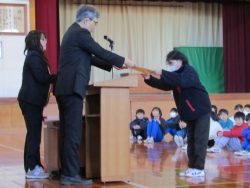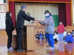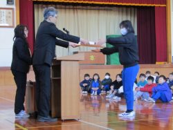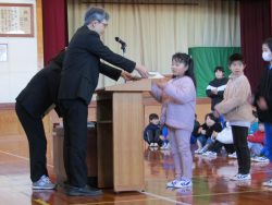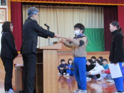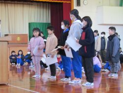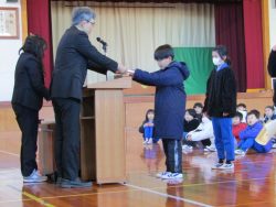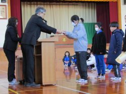今日はたくさんの表彰がありました。「みんなにすすめたい一冊の本推進事業」「書き初め大会」「スポーツ少年団ソフトテニス大会」「社会を明るくする運動」「手をつなぐ子らの作品展」等 です。よくがんばりました。お話を聞いている子供たちも寒い中よい姿勢で待つことができました。
