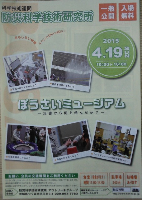 見ると、4月19日(日)に、Dr.ナダレンジャーの研究所である防災科学技術研究所で、「ぼうさいミュージアム」を開催するという案内です。「豪雨(ゲリラ豪雨)」の体験とか、「地震ざぶとん」体験とか、この研究所でしか体験できないこともありそうです。