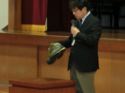 4月の全校朝会は、校長先生の話です。まず、校長先生は、愛用の靴を取り出しました。「何に使う靴でしょう?」と子どもたちに聞くと、さすがに高学年から「山登り」とか「登山」との声が返ってきました。