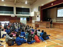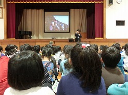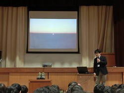 校長先生が「富士登山」をしたときの写真をスクリーンに映して、富士山の話です。早朝に頂上に登り、そして「ご来光」を見た写真も映し出しました。真夏なのにまるで冬のような格好で日の出を待つ校長先生の写真に、子どもたちは驚いています。雲海の向こうに太陽が昇ってくる写真も登場しました。