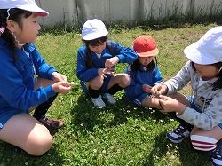▼「指輪、つけてあげる!」と、私(校長)の指に巻いてくれましたが、うまく巻けません。「ううん、太くてダメだ…!」 すみません m(_ _)m
