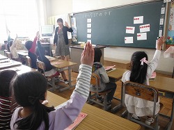 ▼ 1年生はさんすう。5までの数。子供たちは、先生の問いに元気に手を挙げて発表しました。