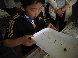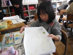 ▼ 4年生は図工。ビー玉やスポンジを使って、絵の具で自由に描きました。思いも寄らない絵ができあがって、とても楽しい授業になりました。