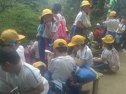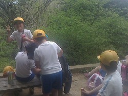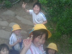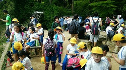 登りはじめて50分。昔、茶屋があった跡地まで来ました。先行していた人々がいたので、ちょっと混んでいます。子供たちは、けっこう元気です。