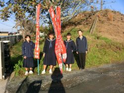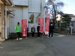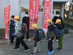 旭中学校の中学1年生や旭中の先生、青少年市民育成会議や生涯学習課の皆様と本校の児童会であいさつ運動を行いました。