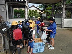 登校後は、JRC委員会がゴミを集めます。ペットボトルなどのリサイクルできるものと、そうでないものに分けています。たくさんの「ゴミ」が集まりました。