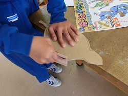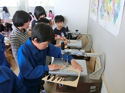 5年生の図工。電動の糸のこぎりを使った作品づくりです。題して「糸のこのドライブ」。それぞれがデザインした作品を、電動の糸のこぎりでどんどん切っていきます。シャカシャカと軽快な音をたてて、曲線も平気です。