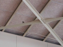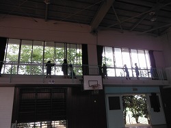 全校朝会の準備のために体育館のドアを開けておいたら、ツバメが入ってしまいました。二羽のつがいのようです。
