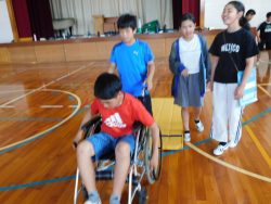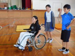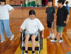 鉾田市福祉協議会の方に来ていただき、6年生が車いす体験を行いました。