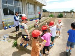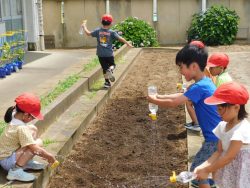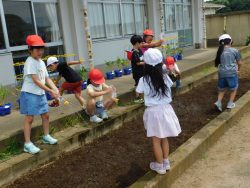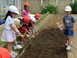 1年生が、ひまわりプロジェクトの種を2年生教室前の花壇にまいてくれました。