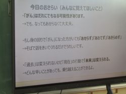健康診断が大切な事、もしがんになっても、治ることがを信じて、落ち込むだけじゃなく、毎日を明るく生活してほしい等、子供たちの心に響くお話でした。