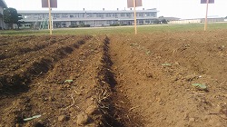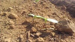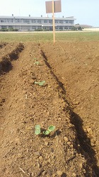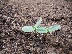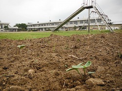 先週の24日に蒔いたひまわりの種。まだ一週間もたっていないのに,滑り台側の花壇に,ほらっ! 種を蒔いた後,しっかりと雨が降りましたので,それがよかったみたいです。本当は一粒ずつなのに,2つ一緒に出ています!