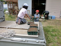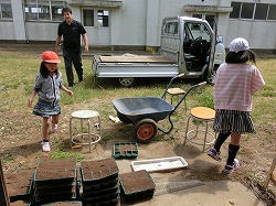 土を連結ポットに入れ、さらに軽トラックに積んで運ぶために、どんどんのせてくれています。教頭先生は大助かり。