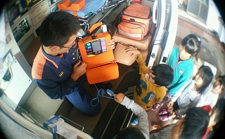 こちらは,救急車の内部です。指で血圧を測定してもらっているのは誰でしょうね。応急措置をするためのいろいろな機器や道具,医薬品などがそろっています。子供たちはとても感心して説明を受けています。