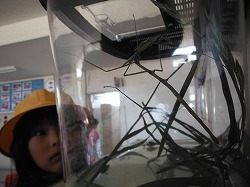 さっそく,飼育ケースに入れて下校準備中の低学年のところに持っていくと,「なにこれ~」って,どこかで聞いたことのあるような反応。「ナナフシっていう昆虫」と教頭先生。
