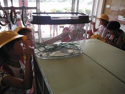 草も入れてあるので,子供たちは「え? どこにいるの?」とすぐには見つかりません。!(^^)! まあ,ナナフシというのは「擬態」と言って,草や木に自分を似せて,身を守っているというわけですから,すぐに見つからないのは当然です。