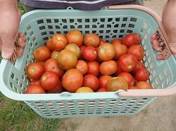 6年生が畑に植えたトマトの「凛々子」。夏休みになって,実を亜画してきています。そこで,昨日(28日)の学びの広場が始まる前に,「収穫」しました。
