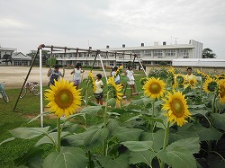 こちらは,校庭の東側のひまわり。ブランコで遊んでいるのは6年生の女子です。実は,例の巨大絵を描く活動をしていたのです。今日の活動を終えて,ちょっと帰りがけに息抜きのブランコ,ってわけです。担任のT先生も写っているのですが,わかりますか?