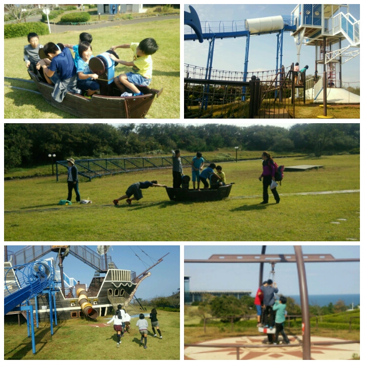 野外炊飯が片付けまで終わり、午後の活動まで時間があるので、「遊びタイム」です😆 海賊船のアスレチックです。 小さな舟を押させられているのは、海賊に捕まった人?