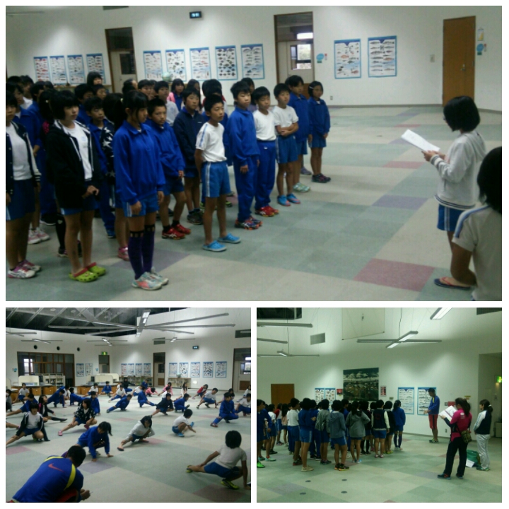 オープンスペースで、朝のつどいです。☺ さて、夕べはちゃんと眠れたのでしょうか? 何だか、眠そうな顔の人もいます。😪 体操をして、体も頭も目覚めさせましょう。💪