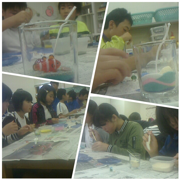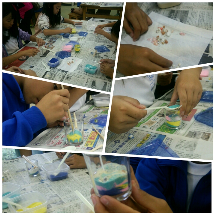 色の砂を重ねて、イメージの海底を作っています。🐚 そこに、かわいい魚🐠を組み合わせれば、ステキなキャンドルのが生まれます。🐳
